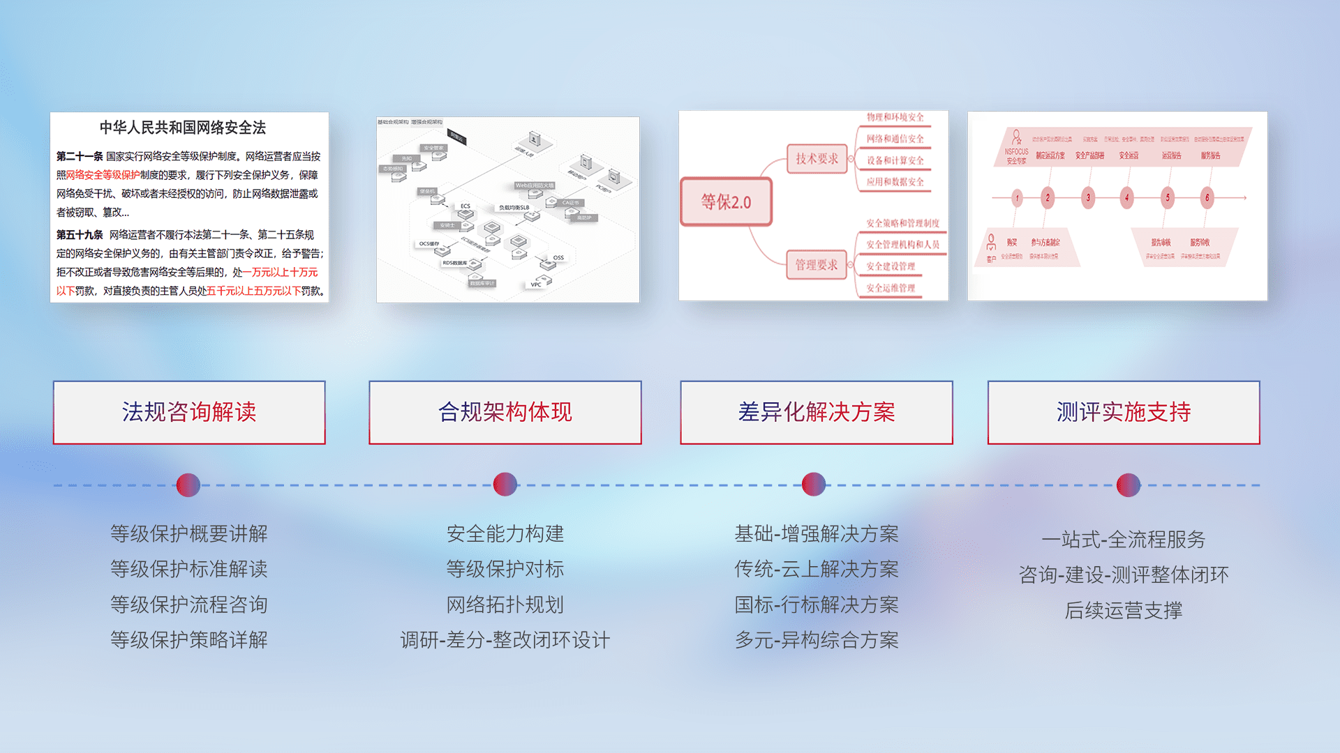 通过专业的法律咨询解读、、合规架构体现、、差异化解决方案、、、、测试实施支持等服务,,为客户量身打造等保合规体系。。。。